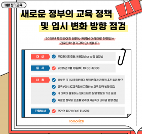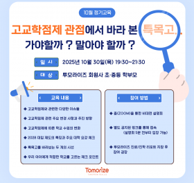 회사명 : (주)투모라이즈 대표이사 : 임정빈 사업자 등록번호 : 667-88-01168 서울시 마포구 독막로 331, 2302호(도화동,마스터즈타워빌딩) 교육사업부 Tel.02-711-5241 Fax.02-701-5241 특허 제 10-1238831 맞춤형 진로설계 및 로드맵 제공시스템 Copyright © Tomorize All rights reserved.